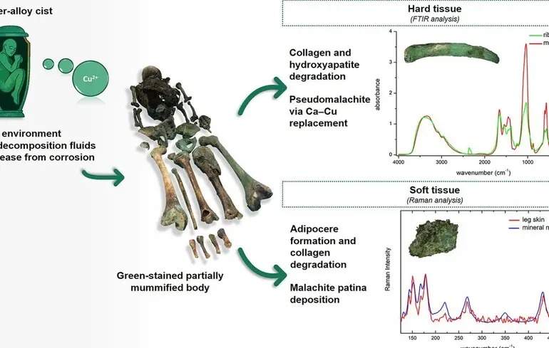 Ці процеси вивільнили кислоти, які повільно роз’їдали труну, виділяючи продукти розпаду міді, які, по суті, змішалися з останками, забарвлюючи кістки і м’які тканини. Кістки забарвилися, тому що іони міді витіснили кальцій, а м’які тканини — тому що вони вкрилися тією самою зеленуватою речовиною (вердигрисом), яку можна побачити на старих статуях.