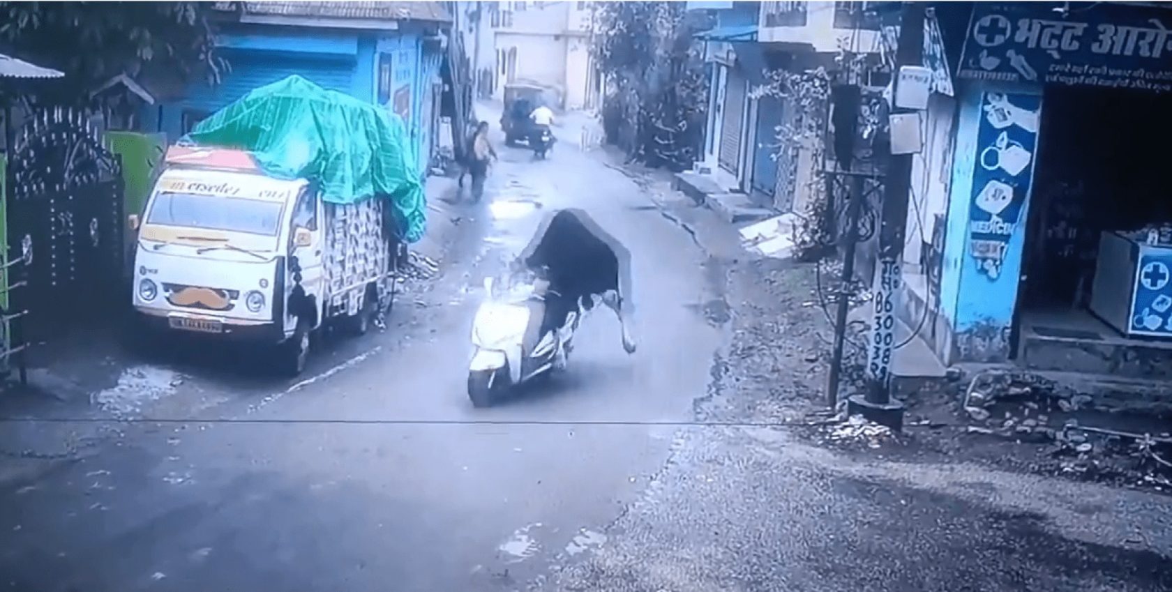 Жінка, яка побачила дії тварини, швидко втекла з дитиною, а тим часом бику вдається проштовхнути скутер далі на пару метрів та проїхатися зі скутером. Та за мить, він врізається у ворота сусіднього будинку, а потім — невимушено йде геть, наче нічого не сталося взагалі.