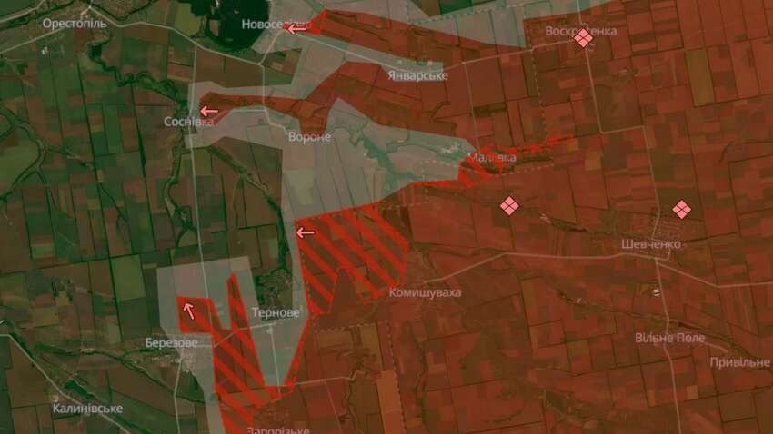 Аналітики проєкту DeepState також повідомили про просування окупантів у Терновому, проте на мапі бойових дій населений пункт знаходиться у сірій зоні та не позначений, як окупований червоним кольором.